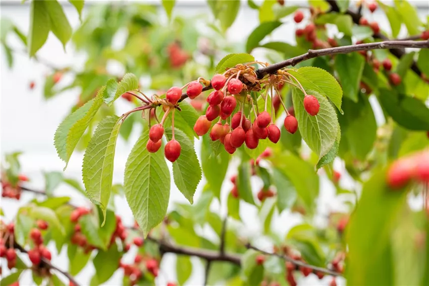 Prunus avium Wenn man Obstgehölze einpflanzen und sich damit einen Naschgarten anlegen möchte, kann man sich zwischen wurzelnackten Pflanzen und Pflanzen mit Wurzelballen entscheiden. Welche Wahl dort getroffen wird, hängt ganz davon ab, wie schnell man die Pflanzen nach dem Kauf einpflanzen kann. Wurzelnackte Obstgehölze sollte man generell so schnell wie möglich in die Erde setzen, weil die empfindlichen Wurzeln schutzlos sind und schnell austrocknen können. Bei Containerware sieht das anders aus. Apfel, Birne, Kirsche und Co. können als Ballenware jederzeit in die Erde gesetzt werden. Generell gilt aber: egal, ob wurzelnackt oder Ballenware, beide Gehölze sollten vor dem Einpflanzen mit den Wurzeln ins Wasser getaucht werden. Neben den Klassikern wie Apfel und Birne, kann man aber auch andere Obstgehölze einpflanzen, die leckere Snacks liefern. Besonders beliebt sind auch Beerenobst-Sträucher, wie Himbeere, Johannisbeere oder Heidelbeere. Diese Beeren sind jeder für sich ein wahres Superfood und besonders bei Kindern sehr beliebt. Kern- und Steinobst hat aber auch nicht nur Apfel und Co. zu bieten. Mittlerweile zählen zu den beliebten Obstgehölzen auch Pflaume, Mirabelle, Pfirsich und Co.