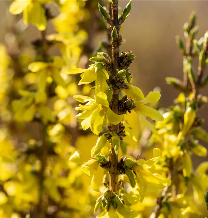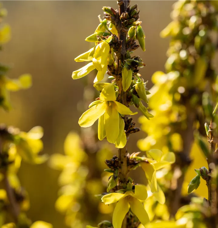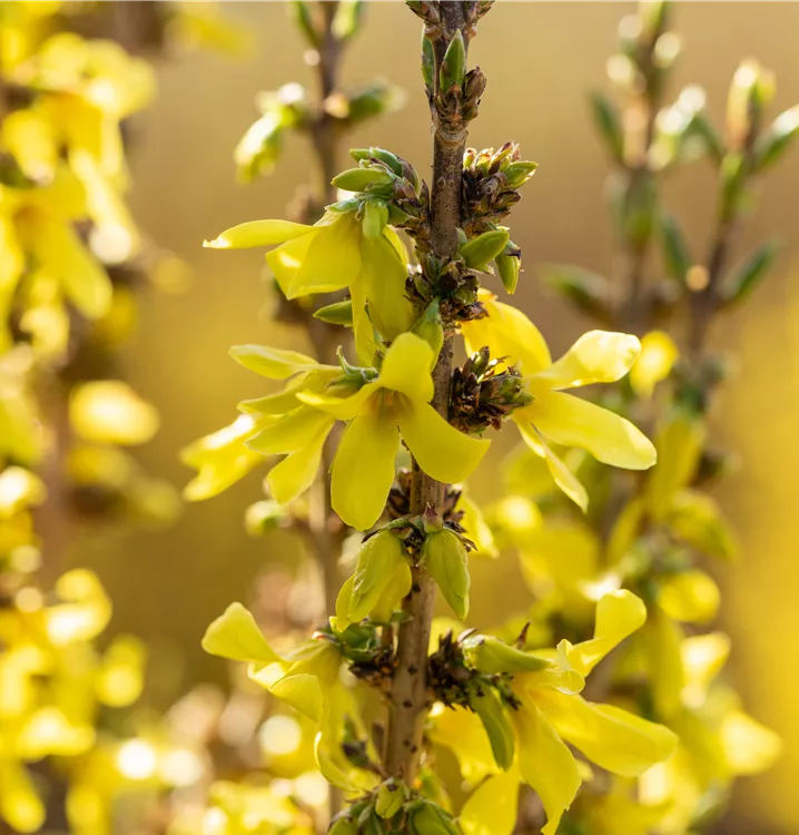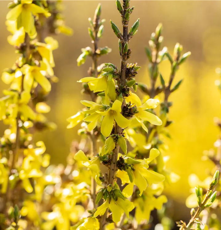 Die gelben Blüten der Forsythie 'Mikador'® erscheinen in Rispen von März bis Mai.