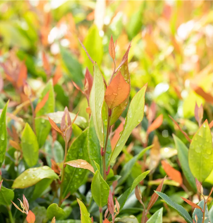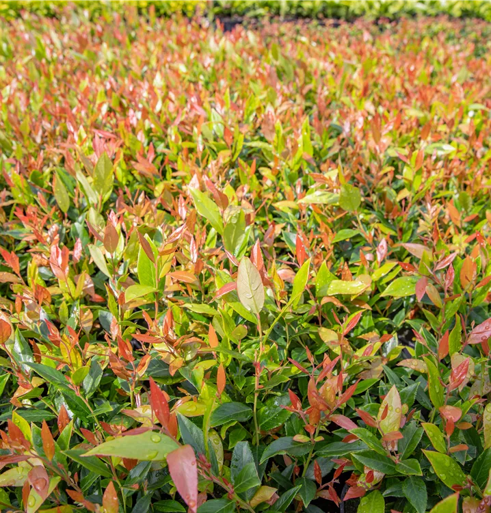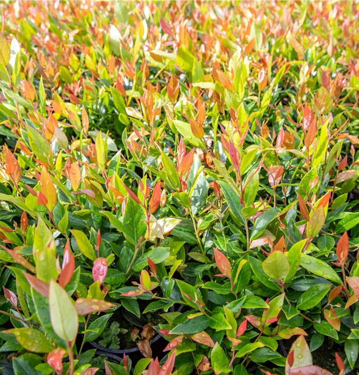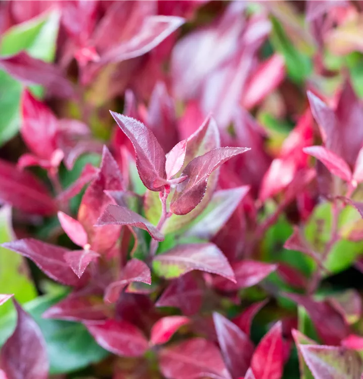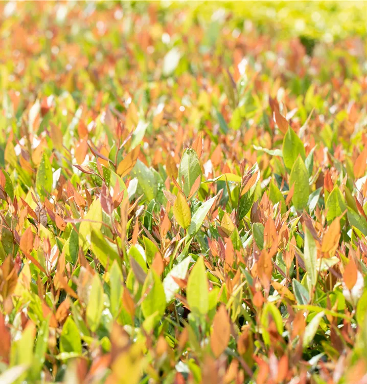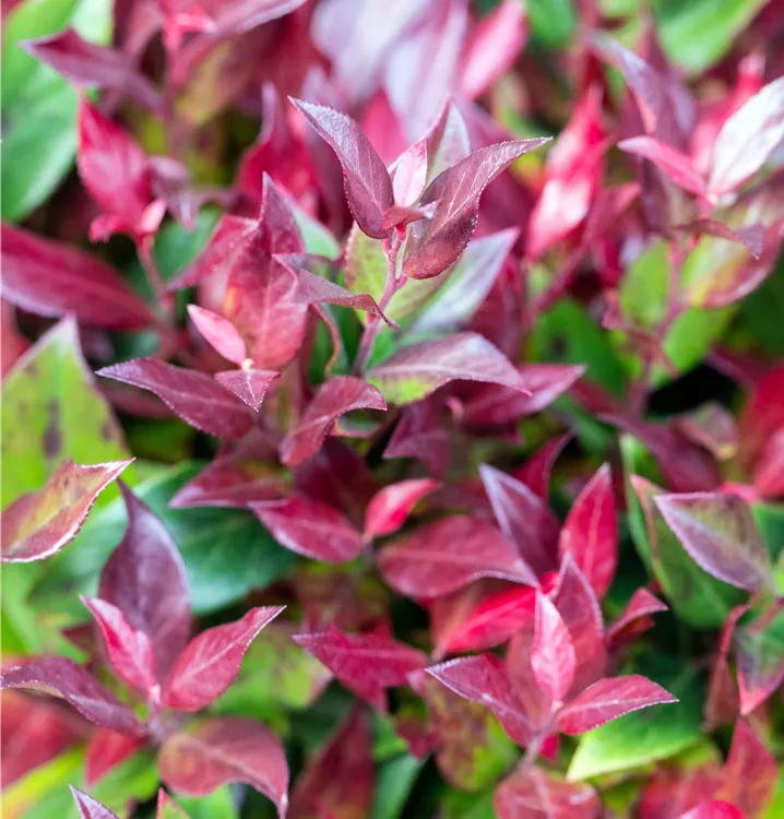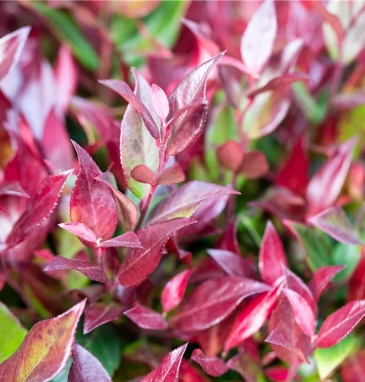 Die immergrünen Blätter der Traubenheide 'Little Flames' sind grün-rot, lanzettlich, glänzend, gezähnt.