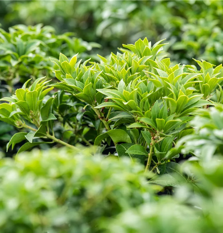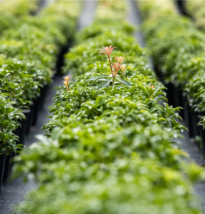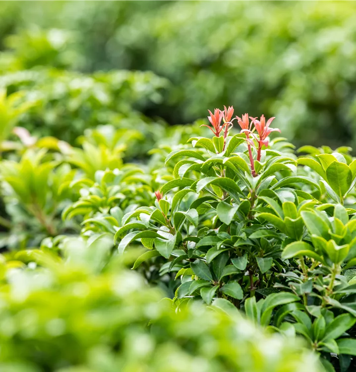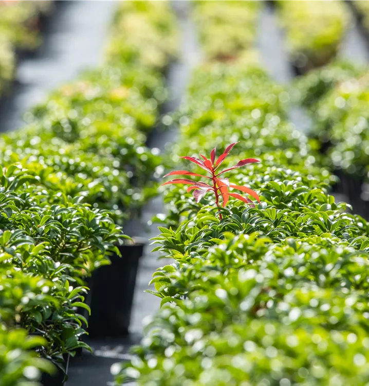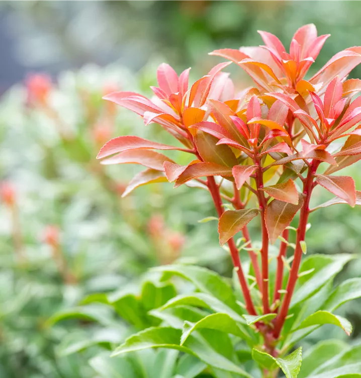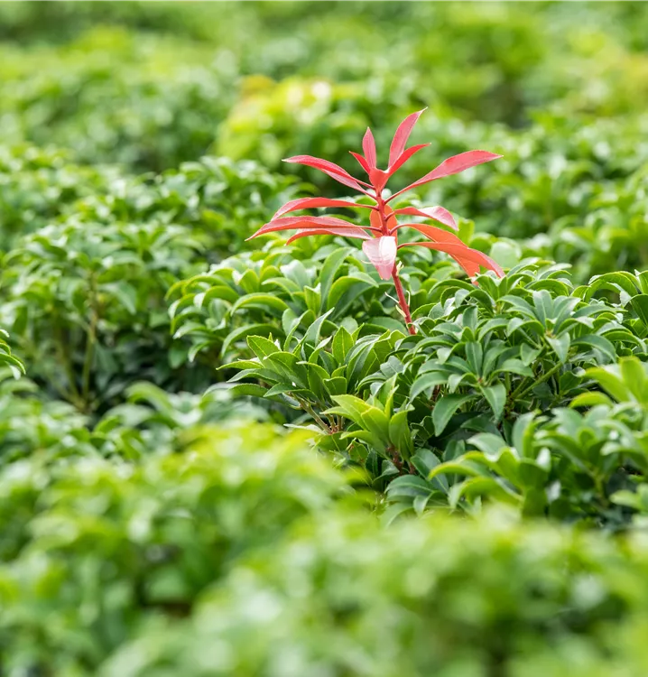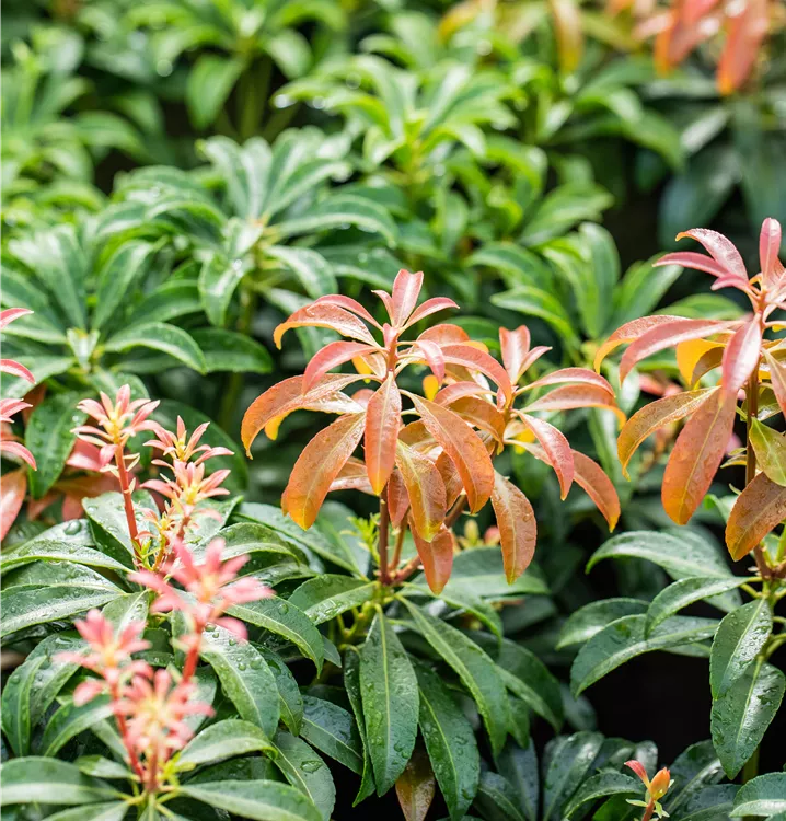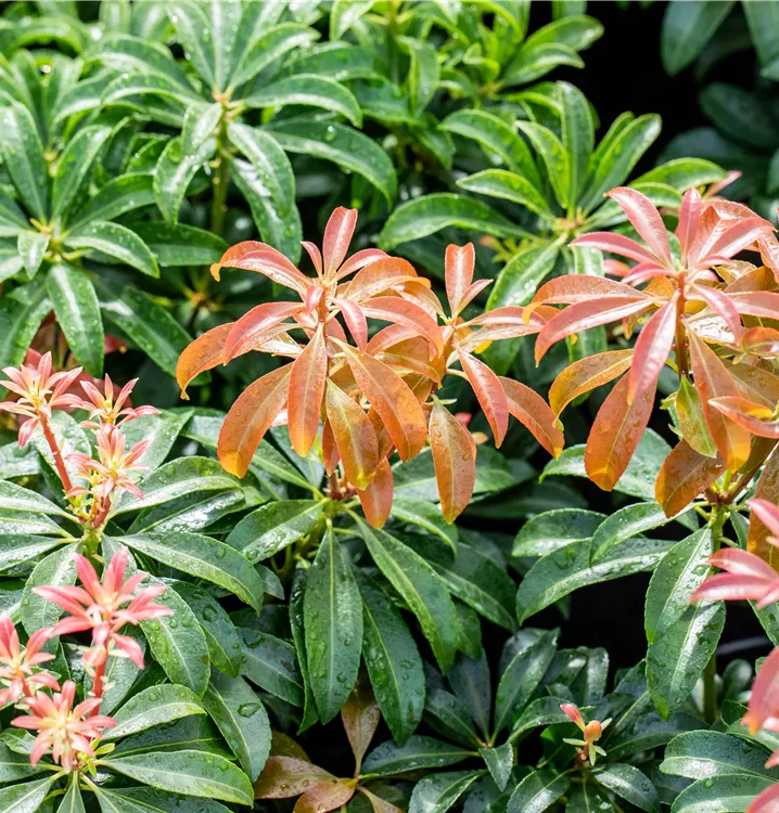 Das Schattenglöckchen 'Bonfire' (Pieris japonica) ist ein buschiger, breiter Strauch, der weiße, in Rispen angeordnete Blüten hervorbringt. Sie erscheinen von März bis Mai. Zudem trägt das Schattenglöckchen 'Bonfire', glänzende, lanzettliche, dunkelgrüne Blätter. Der leuchtend rote Austrieb ist ebenso ein interessanter Anblick. An einem halbschattigen bis schattigen, windgeschützten Standort mit humosem, nährstoffreichem Boden erreicht es gewöhnlich eine Höhe von ca. 1 m und wird ca. 1,1 m breit.