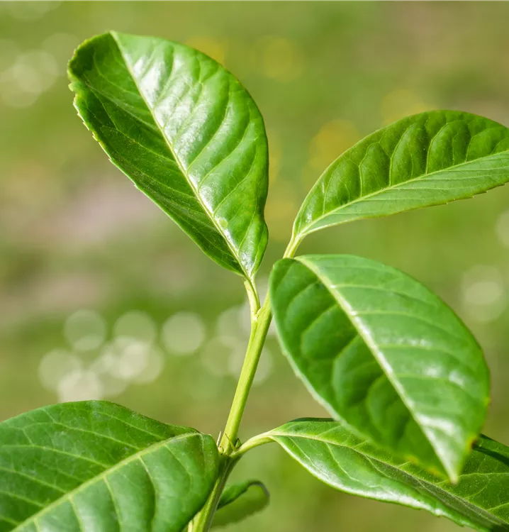 Die immergrünen Blätter der Lorbeerkirsche 'Etna'® sind dunkelgrün, eiförmig, glänzend, wechselständig. Kupferbrauner Austrieb.