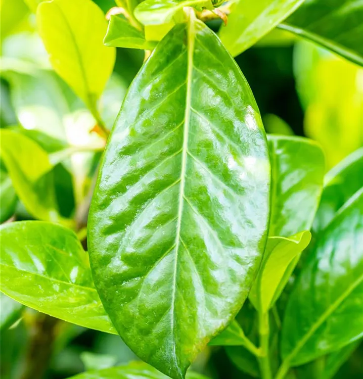 Die immergrünen Blätter der Lorbeerkirsche 'Novita' sind hellgrün, eiförmig, glänzend, wechselständig. Diese sind etwa 15 - 20 cm groß.