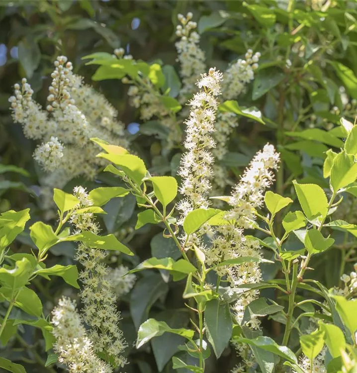 Die weißen Blüten der Portugiesischen Lorbeerkirsche 'Angustifolia' erscheinen in Trauben von Juni bis Juli.